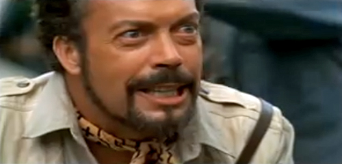 Congo was a so bad it’s almost good movie bereft with a horrible storyline, wooden acting from actors who should have known better), and seriously cheap ass monkey suits but there was one gem amongst the dung and that was Tim curry’s Herkermer Homolka. Herkermer was a smarmy Romanian philanthropist who was obsessed with finding the lost city of Zinch and getting his grubby little hands on the city’s stash of diamonds. Curry whipped out a preposterous accent and put so much into his line readings (especially all the times he uttered “the city of Zinch” that I was amazed that any of the fake African scenery escaped unchewed.