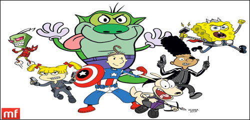 Spongebob from SPONGEBOB SQUAREPANTS as Thor; Doug from DOUG as Captain America; Stimpy from REN & STIMPY as The Hulk; Zim from INVADER ZIM as Iron Man; Angelica from RUGRATS as Black Widow; Gerald from HEY ARNOLD! as Nick Fury; Rocko from ROCKO’S MODERN LIFE as Hawkeye