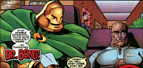 Lester Verde was a bullied momma’s boy who turned his tormented childhood into a focus on a journalism career. He would later begin playing in a punk band on the side where he would be in a freak accident with a prop guillotine that saw him lose his left hand. This trauma drove Lester mad and he did what all victims of lost limbs do…he put a giant bell on his head, fastened a metal ball on his stump, used his (heretofore unknown) scientific genius to create an army of animal/human hybrid henchmen and set out to become a super-villain Doctor Bong!