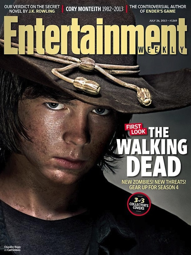 This new cover image from an upcoming issue of Entertainment Weekly shows a Carl Grimes that is so far removed from the annoying little snot who never did what he was told in Season One. Carl is now looking like a bonafide sociopath who is eager to pop a cap in the ass of any zombie (or human) who has the misfortune of shambling into his view and young Chandler Riggs has really mastered that dead-eyed stare. He’s also my favorite character on the whole show now.
