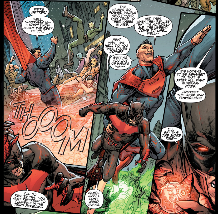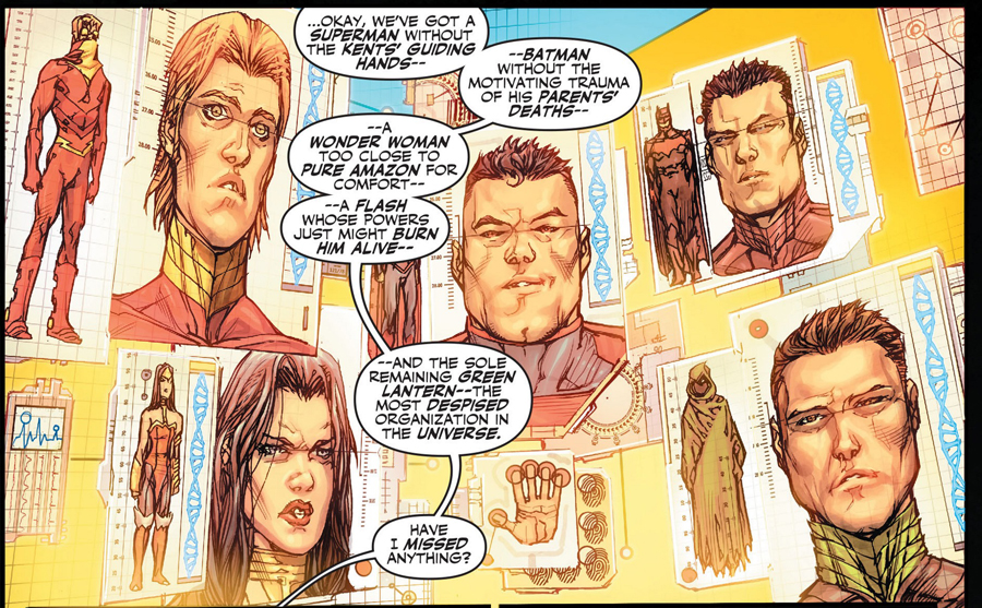 Now to the story…as a first issue you don’t go in expecting to have every mystery laid out for you but I was pleased with what was given to me. I expected to get zero info on who these future heroes were but Giffen and DeMatteis let that cat out of the bag almost immediately and still managed to keep me completely in the dark about what the bigger mysteries of this come are. Giffen and DeMatteis also have lost none of their chemistry and wit. They are not going for the full on slapstick like their last stab at the Justice League but the bickering and banter is pretty funny without being overdone and despite being a bit wordy you don’t feel like there is too much talking going on, it feels just right. I am also liking how these versions of the characters we know so well have been flipped around with Superman being a favorite of mine. Having Superman be a colossal douche verging on the sociopath side of things is a neat twist and I can’t wait to see where they take this character in particular.