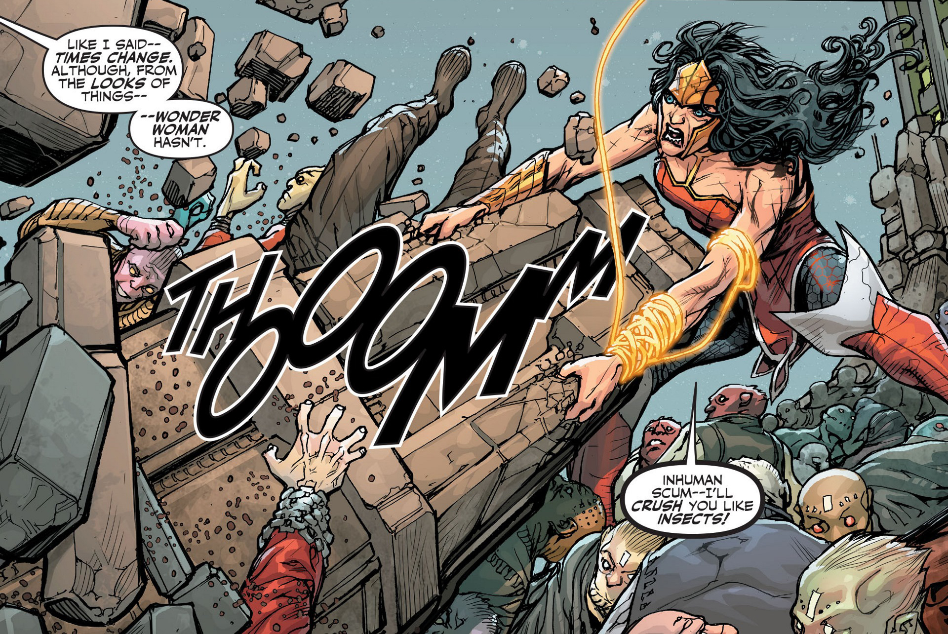 I know it is only the first issue and there are reasons for all of these characters to act the way they are acting but I am really not feeling this version of Wonder Woman…she’s a bit too one note and the whole maniacal, sexually aggressive amazon thing seems a bit too cliche.