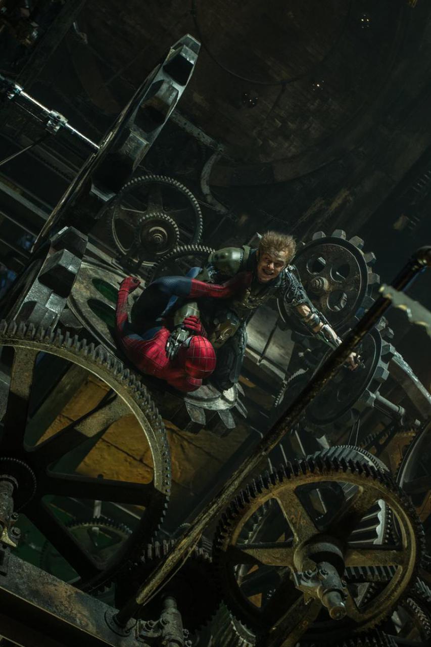 Supposedly the pic posted below is of Dane Dehaan as Harry Osborn/Green Goblin battling Spider-Man in some clock tower type place. But instead it looks like someone at Sony rescued Geoffreys’ from his failed career in gay porn to embody his most famous role once again.